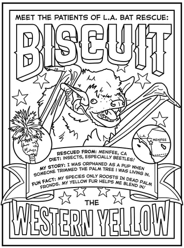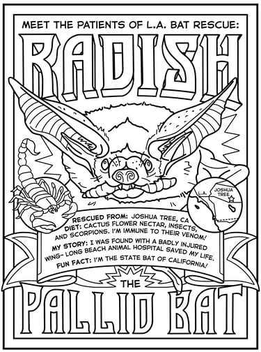 Created for Los Angeles Bat Rescue, a 501(c)(3) nonprofit dedicated to the rehabilitation and release of California native bat species, this project involved designing and illustrating two coloring pages for use in community outreach events. Each page spotlights one of the organization’s future educational ambassador bats: Radish the Pallid Bat, and Biscuit the Western Yellow Bat (permit pending).
