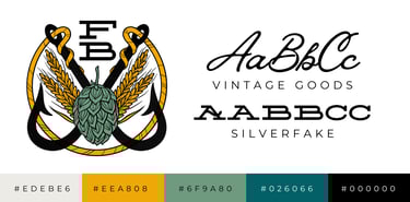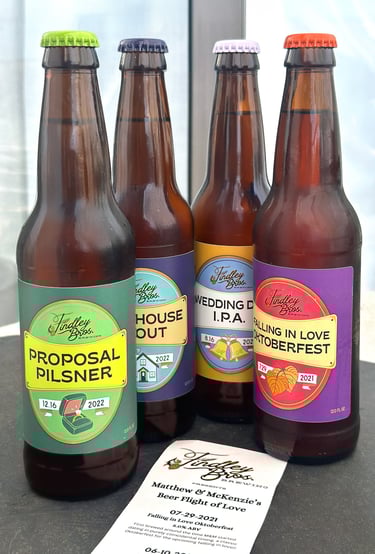 The brief called for a logo design that incorporated three specific elements into its starting letter: a wheat stalk, a hops plant, and a fishhook. Most important was a set of labels that could be used for their wedding favors: a four-pack of the groom’s standout brews, each tied to a meaningful chapter in their relationship.