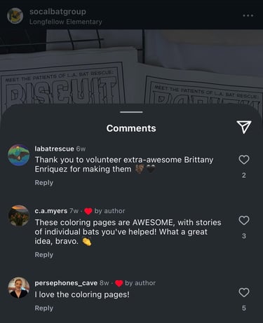 Debuted at Longfellow Elementary’s 2025 Earth Day Fair, the coloring pages were a hit with students and parents alike. They’ll continue to be used at future events as a creative, approachable way to spark curiosity and appreciation for these often-misunderstood animals. The pages even earned a callout on Instagram from SoCal Bat Group.