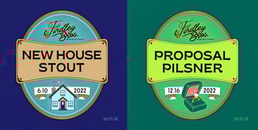 Each of the four beer labels was carefully designed to complement the color of its intended bottle cap, and to reflect the mood and narrative of its brew name. Hand-drawn central motifs included subtle nods to the bride and groom: a pair of cordiform leaves for the Oktoberfest lager; a home with heart-shaped chimney smoke for New House Stout; wedding bells engraved with the couple's initials and a "something blue"-themed color palette for Wedding Day IPA.